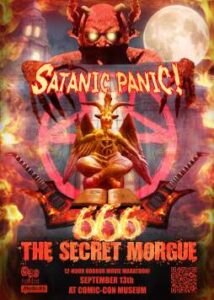 Saturday September 13 saw the sixth Secret Morgue movie festival, a marathon of 6 theme-linked horror films screened all day and into the late night at the Comic-Con Museum in Balboa Park by San Diego Film Geeks. Being the 6th the theme was announced to be ‘satanic panic.’ I have attended 4 previous regular Secret Morgue screenings and one special two years ago with a unifying theme of witches and witchcraft, loving and enjoying each marathon.